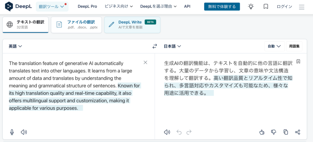 長い文章をすぐに翻訳できるので、外国のコンテンツからの情報収集や、多言語対応を前提とした文章の翻訳作業を効率よく行えるのがポイントです。