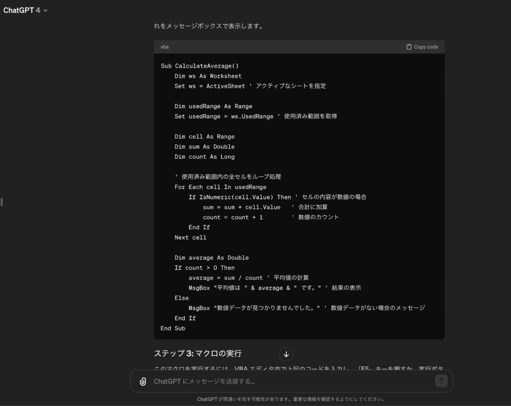 たとえば、生成AIの代表格であるChatGPTに「UsedRangeプロパティを使って、Excel内のデータで平均値を計算するVBAのコードを作成して」と指示を出してみますね。